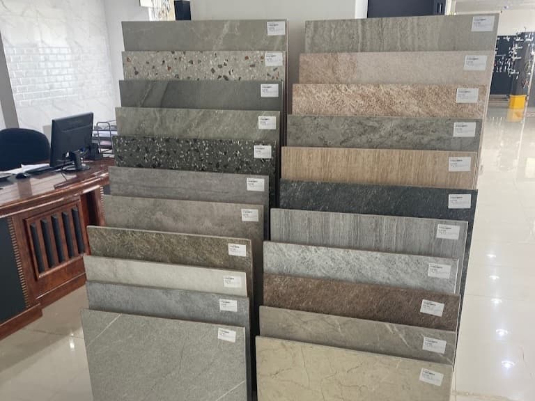 • سيراميك بورسلين للأرضيات بلون إسمنتي مطفي بأبعاد 120 × 60، بسماكة 2 سم. يتميز السيراميك بقدرته على امتصاص الماء ومقاومته للبقع، وهو مصنوع في الهند.